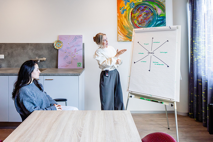 De focus in de nazorg ligt op resocialisatie, het weer oppakken van het dagelijks leven en het versterken van de eigen autonomie in verbinding met anderen. De deelnemers leren de triggers voor hun eetstoornis beter herkennen en maken een terugvalpreventieplan. Ook werken we verder aan het verbeteren van de lichaamsbeleving. Als de eetstoornis verder naar de achtergrond is verdwenen, kunnen er vragen over de eigen autonomie naar boven komen, zoals: wie ben ik zonder eetstoornis, wat wil ik met mijn leven, hoe voorkom ik dat ik terugval in oude patronen? De deelnemers werken aan het vergroten van zelfsturing (autonomie); onder het motto ‘van klacht naar kracht’ leren ze de regie te (her)pakken in verschillende rollen in hun leven.